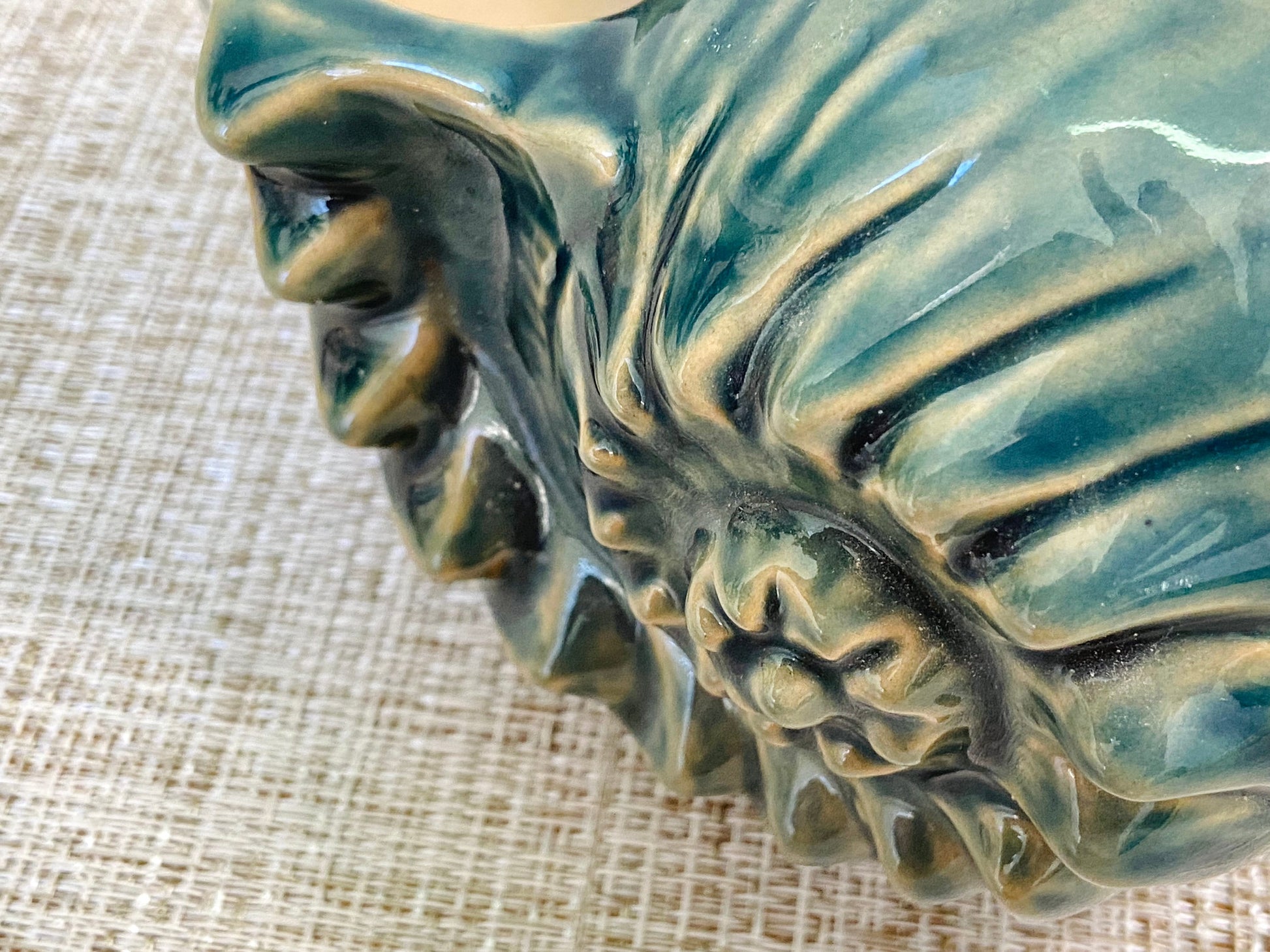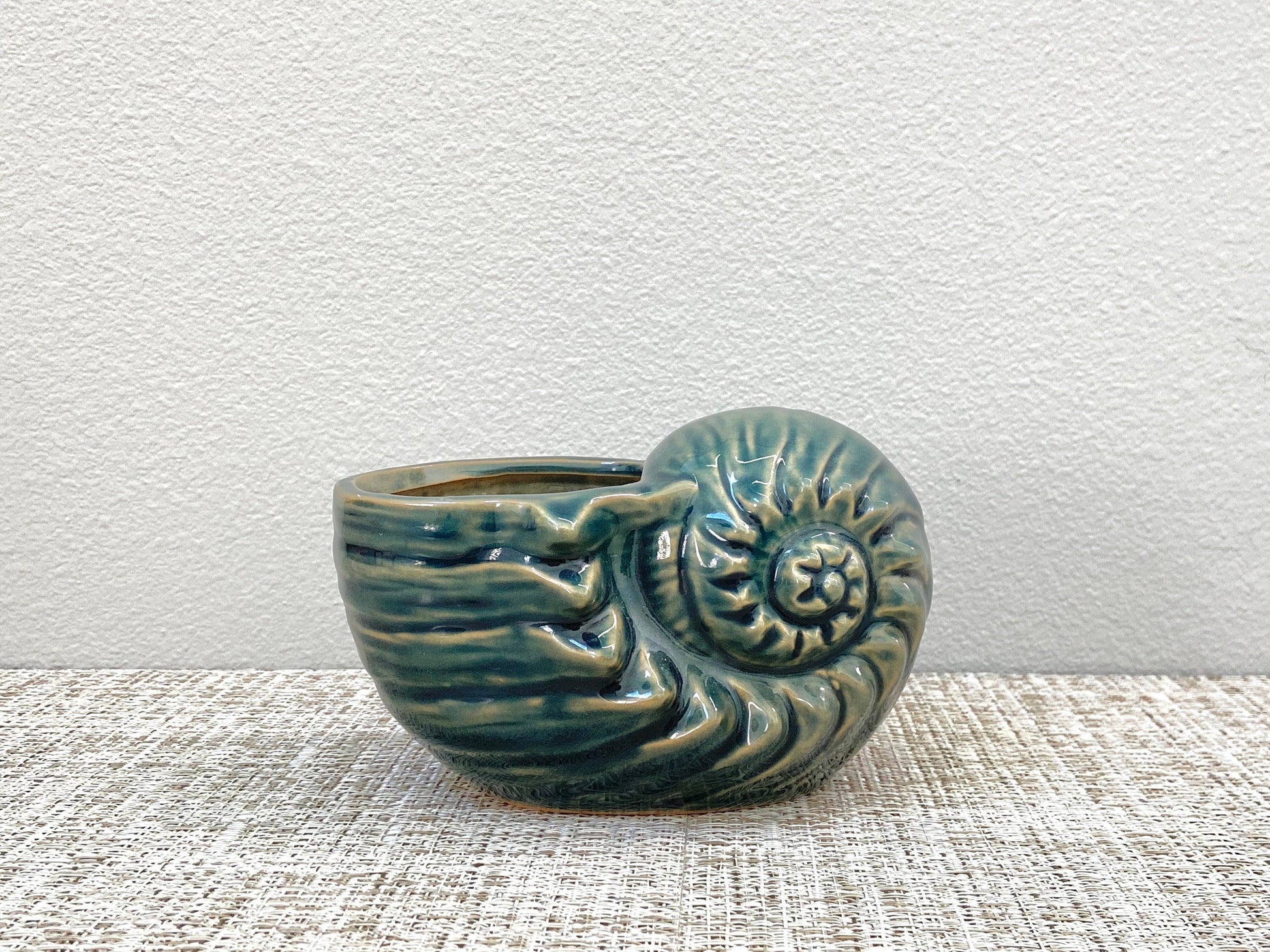 This pot features a smooth, glazed surface with conch shell-like texture. It has an opening half the size of the pot, creating a visual affect of a plant growing out of the shell. It is hollow on the inside to allow plenty of growing room. This pot is good for small to medium sized succulents, air plants, or just as decoration. A small drainage hole is included.