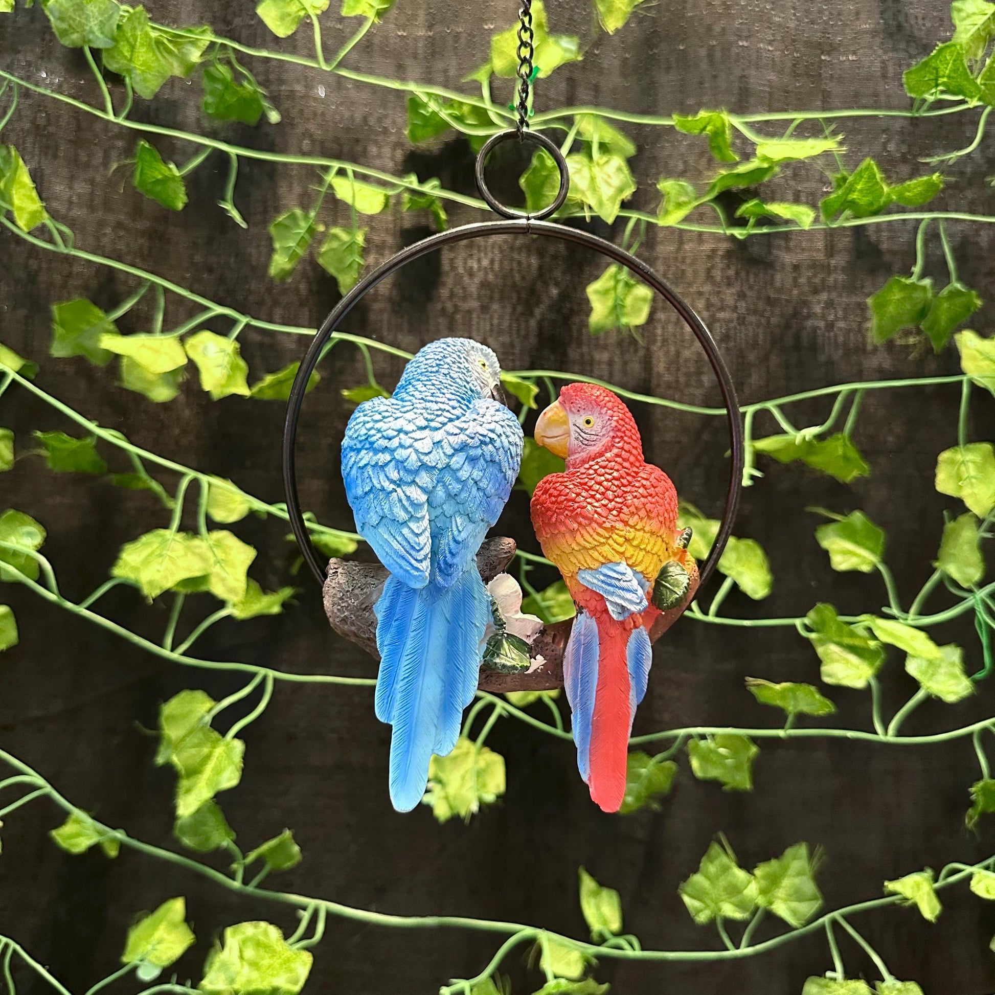 The birds are made of resin, and the ring is made of metal. The ring comes with a hook at the other end of the wire for hanging.