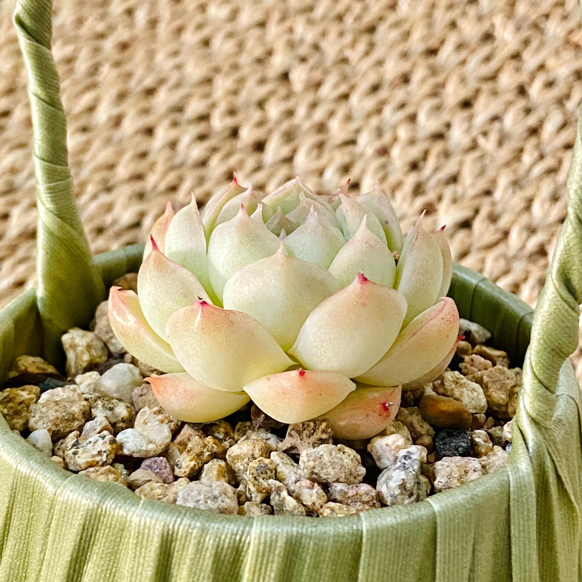 - An echeveria succulent of the same variety as the photos, potted in a durable green basket